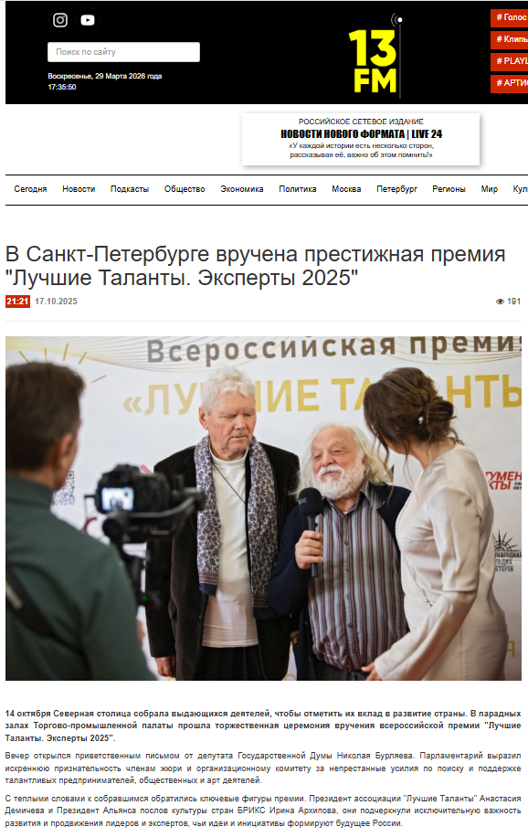 14 октября Северная столица собрала выдающихся деятелей, чтобы отметить их вклад в развитие страны. В парадных залах Торгово-промышленной палаты прошла торжественная церемония вручения всероссийской премии "Лучшие Таланты. Эксперты 2025".